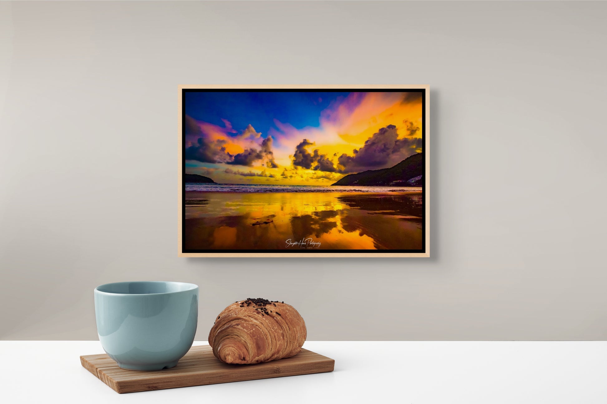 Immerse yourself in the vivid beauty of Thailand’s shoreline with “Phuket Coastal Afterglow.” Captured at sunset, this canvas print showcases the dramatic colors and reflections that fill the sky and sea as daylight fades along Phuket’s coast. The scene blends deep blues, radiant golds, and striking cloud formations, creating a sense of tropical calm and energy all at once.